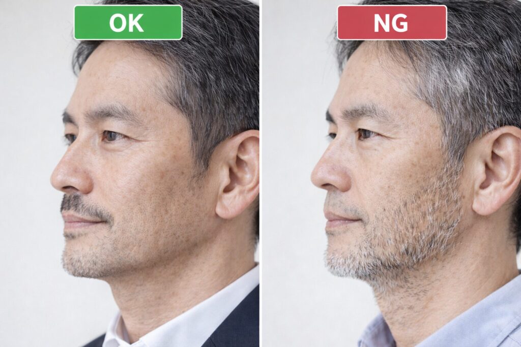 - OK:短く整った髭(肌が見える)