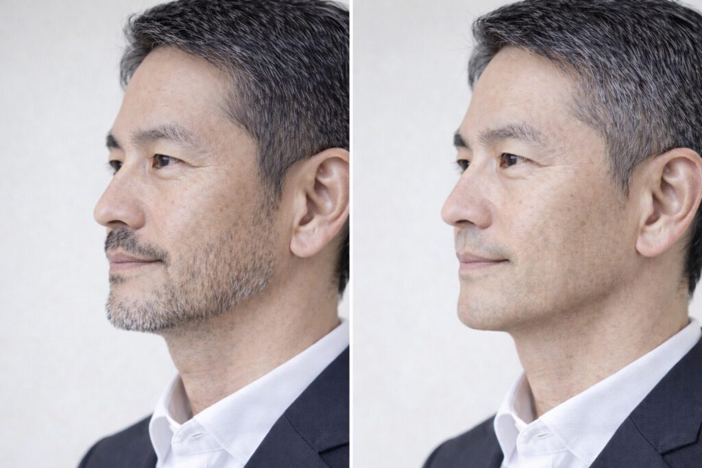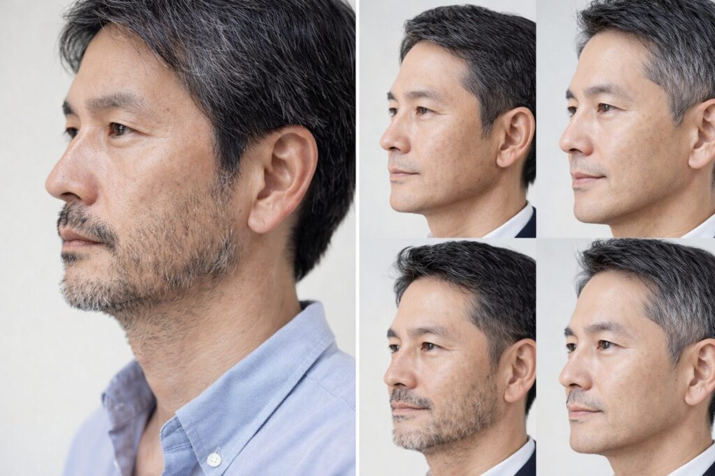 - 右:短く整えた髭 or 剃った状態